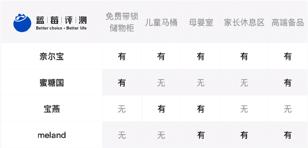 这四家儿童乐园都配备了亲子卫生间,除了宝燕,其它三家都提供了免费的贵牌纸巾、湿巾、纸尿裤、棉签等卫生用品。